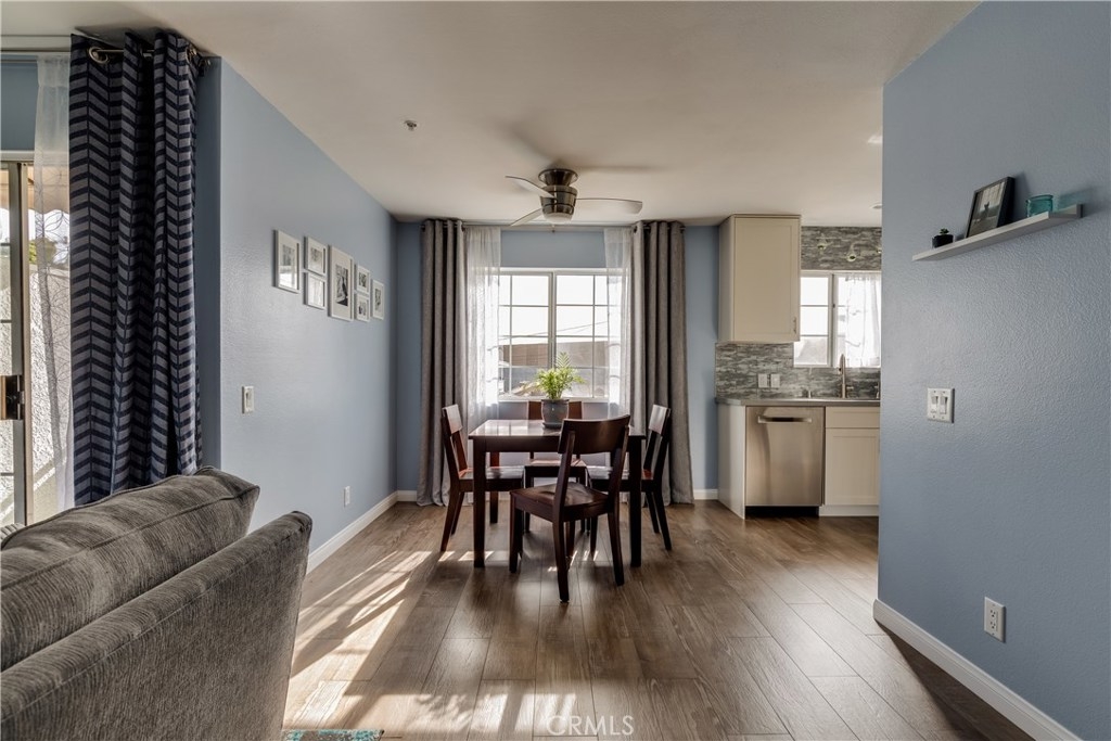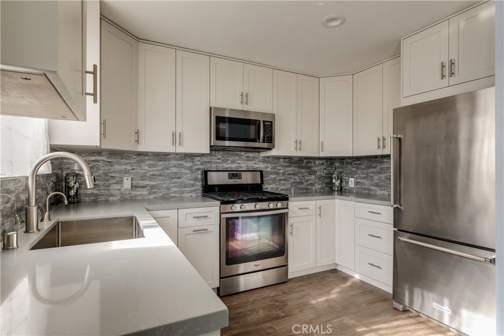 As you enter the 3 story unit you are welcomed by beautifully comforting wood grain tile floors in the living room, continue pass the dining area and enter the remodeled open kitchen with white craftsman cabinets, stone countertops, and glass tile backsplash. A downstairs half bath with stone countertops and custom design accent wall, private balcony off the living room, and overall flow of the first floor make for a great space to have a date night in or entertain friends or family. At the end of the day you head upstairs to the spacious 2 bedrooms, with recessed lighting, and a large remodeled full bathroom, complete with a tile shower tub combo, and a large vanity with lots of counter space. And if building living with an outdoor space is what you want, then come see the third floor private patio great for a morning coffee, sun bathing, or night cap. All of these conveniently located near McCambridge Park, Burbank Tennis Center, Costco, and shopping and dining at the Empire Center.