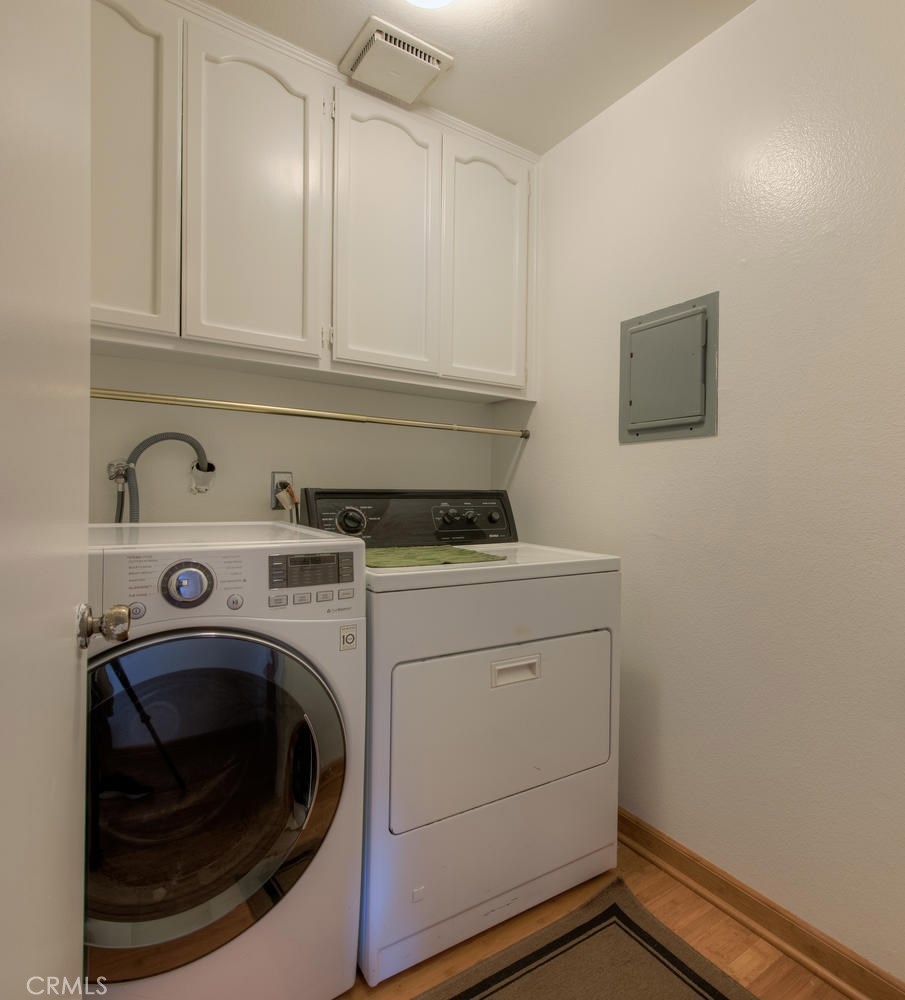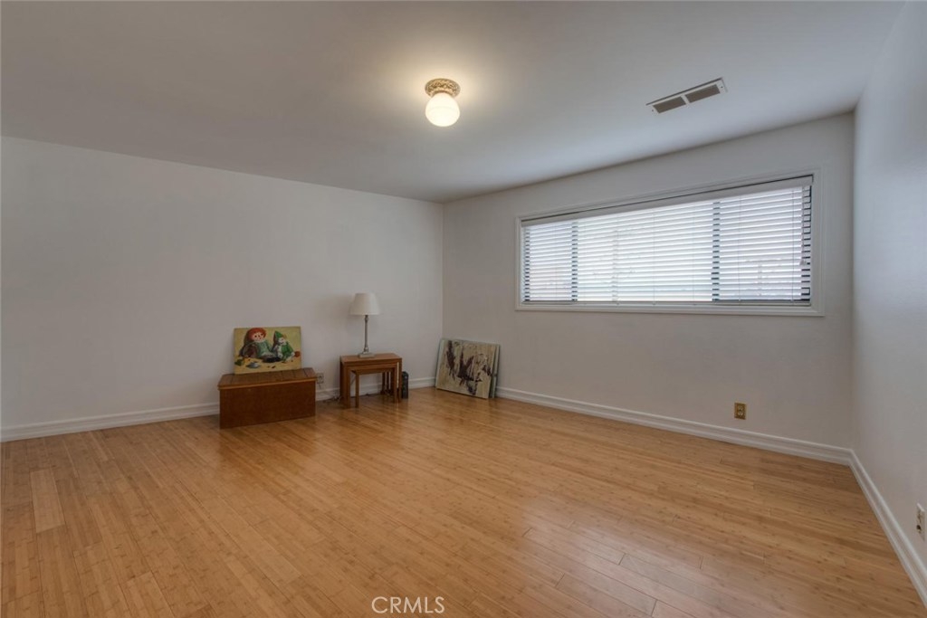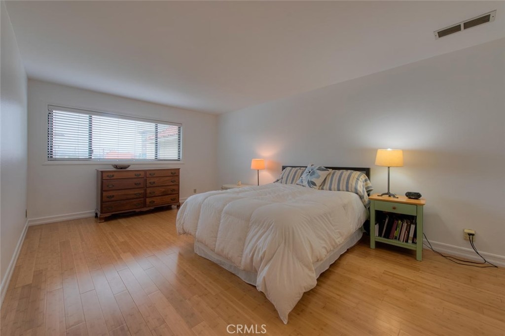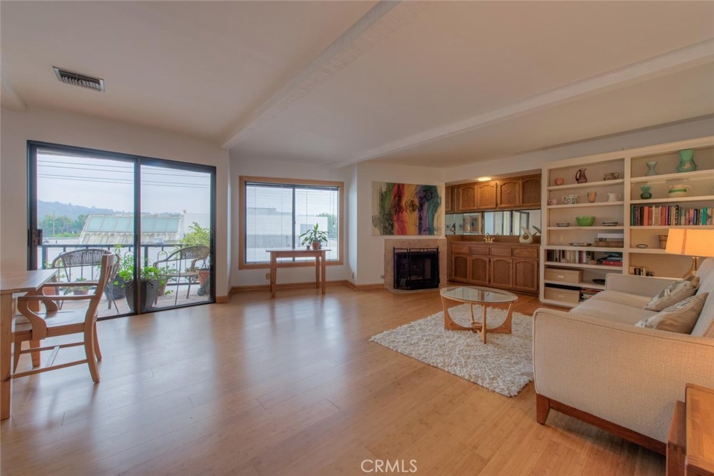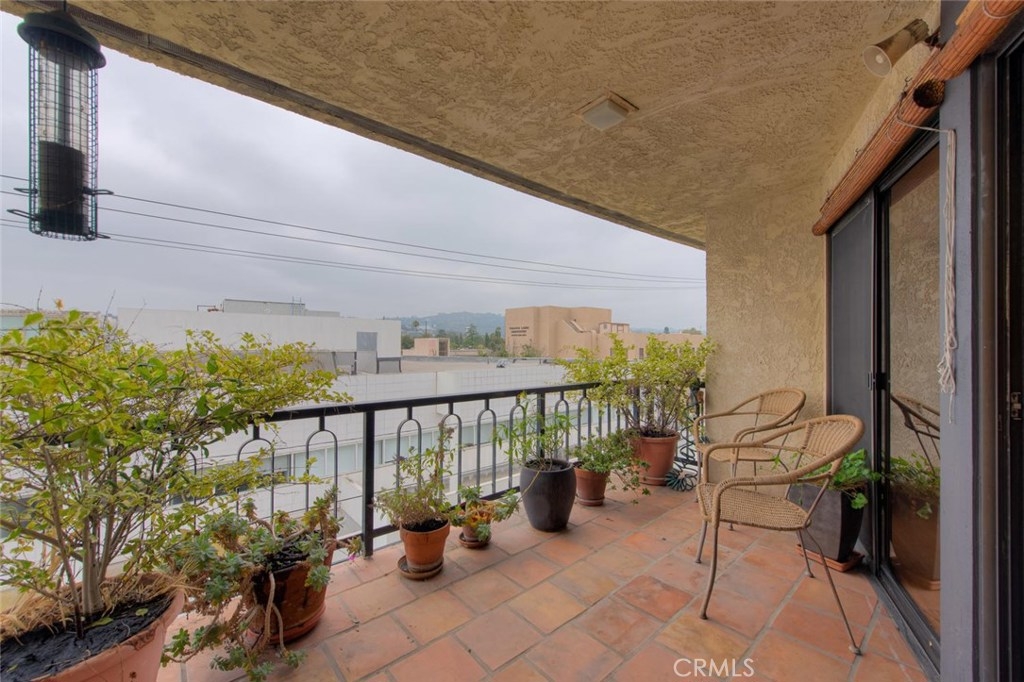 Attractive top floor condo with a view of a mountain, in the heart of Toluca Lake Village. Formal entry leads to the airy, open-concept living / dining rooms. The private patio is a perfect spot for some quiet time and evening relaxation. Built in bookcase, fireplace, wet bar and beamed ceiling are just some of the nice features this very pleasant living space has to offer. An ecology minded owner installed bamboo floors, as well as energy efficient, heat reducing windows in the bedrooms that are facing west. Newly painted white kitchen cabinets are dramatically contrasted with the black granite counters and the 5 burner cooktop. Laundry room is inside the unit, washer and dryer are included. Smart thermostat (NEST) can be set remotely by a smart phone to control the A/C and the energy efficient heater with 2 stage operation. Two side by side parking spots and two storage bins are in the gated security garage. Appliances are included without warranty. This small complex offers a rec room and a small gym. BBQ area with outdoor seating is on top floor for those favoring dining alfresco. Walking distance to the Village restaurants and shops.