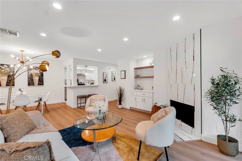 Here is a stunning remodel of a gorgeous condo with a prime location above Glenoaks in Burbank. You can see that this renovation is a labor of love with attention to detail-- and it's all about fine living here! The layout of this home is ideal with each bedroom on the opposite side-- great for privacy. The kitchen is a cook's dream with beautiful quartz counters, high end brass finished hardware, soft close cabinets, an oversized metal sink, and stainless steel appliances. The living room is large with plank flooring, recessed lighting, a dining area, a cocktail counter, and a dramatic fireplace with more of that absolutely gorgeous quartz. We know outdoor space is important, and the private patio is great for relaxing or outdoor dining, and it can be accessed directly from each of the bedrooms. The primary suite has 2 large closets and a stunning private bath with gorgeous finishes. This condo has its own laundry room. The building is great with 2 side by side parking spaces, and an elevator for easy access. We can't say enough about this amazing location with easy access to shops and dining on Glenoaks, McCambridge Park, and of course all that trendy Downtown Burbank has to offer.