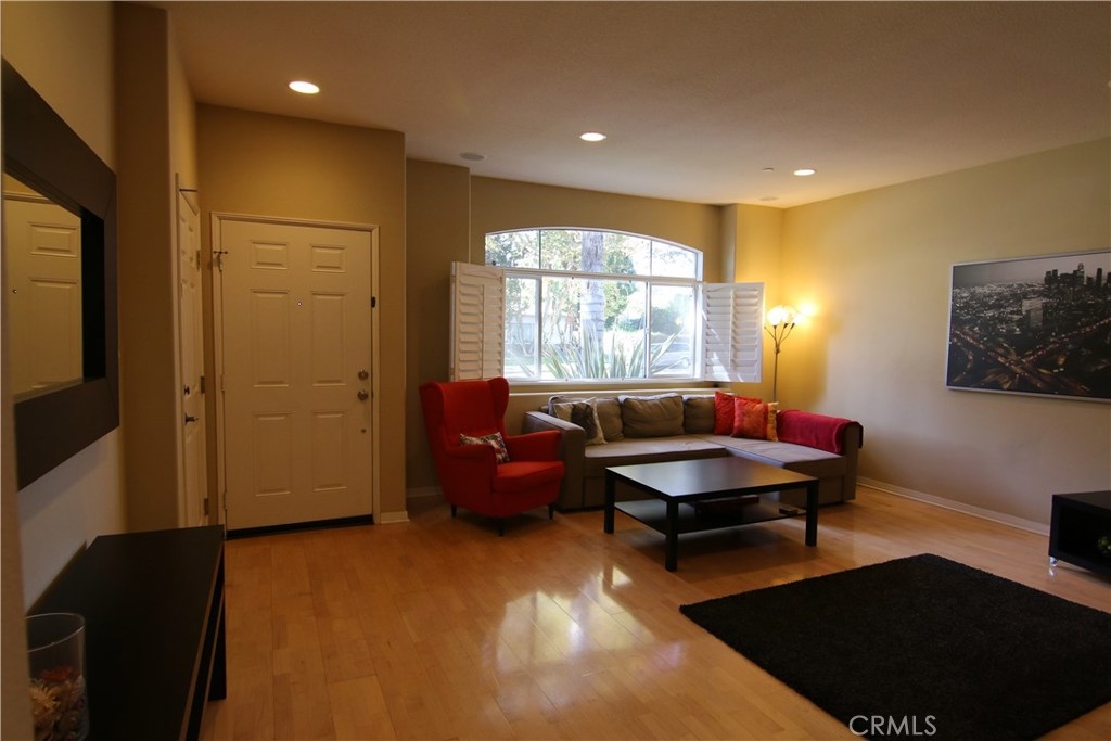 Clean, sharp, and bright townhouse style unit with its own entrance and direct garage access. Conveniently located in this desired Burbank neighborhood and close to studios, several parks, abundant restaurants, the LA Zoo, and Griffith Park. Enter the living room with wood floors, high ceilings, and recessed lighting. The formal dining area is open to the kitchen and has wood floors and patio access. The kitchen has tile floors and countertops, a breakfast bar, a large pantry, and lovely garden/courtyard views. There are 3 good size bedrooms including the master suite with plenty of closet space and a private bathroom. With plenty of storage space, direct garage access, and laundry in the unit this beautiful unit will not last long.