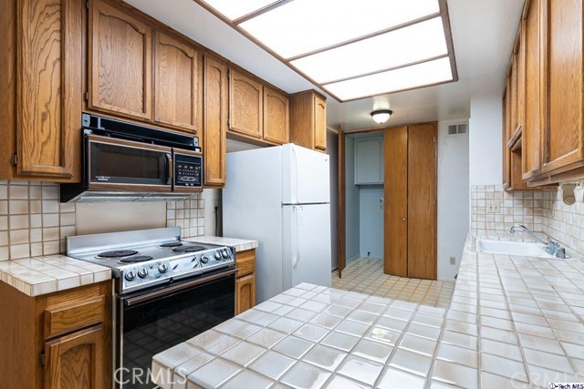 Placed within a lovely brick building in the highly coveted city of Burbank is this cute 2-bedroom, 1.5-bathroom, 1,242-SqFt condo! With a double door entrance opening to the foyer, you're greeted by a light filled living room offer plush carpeting, a tiled fireplace with raise hearth and seating space, glass sliding door access outside to the private patio, and a wet bar with storage that is tucked away by two closet doors. In the dining room, you're offered views of the patio. The warm toned kitchen features tiled counters, caramel toned cabinets, a convenient laundry space with additional storage behind a set of bifold doors, and built-in appliances. Into the largest of the bedrooms, find another entrance out to patio, a large walk-in closet, and a split bathroom with jacuzzi tub plus dual sink vanities. Throughout the home natural light floods in through all the large pleasant windows, creating an inviting and comfortable ambiance. Nearby the major studios such as Disney, Warner Bros., and DreamWorks, Johnny Carson Park, Trader Joe's Pavillions, Porto's Bakery and Cafe, minutes away from Downtown Burbank, and easy access to the Ventura and 5 Freeways!