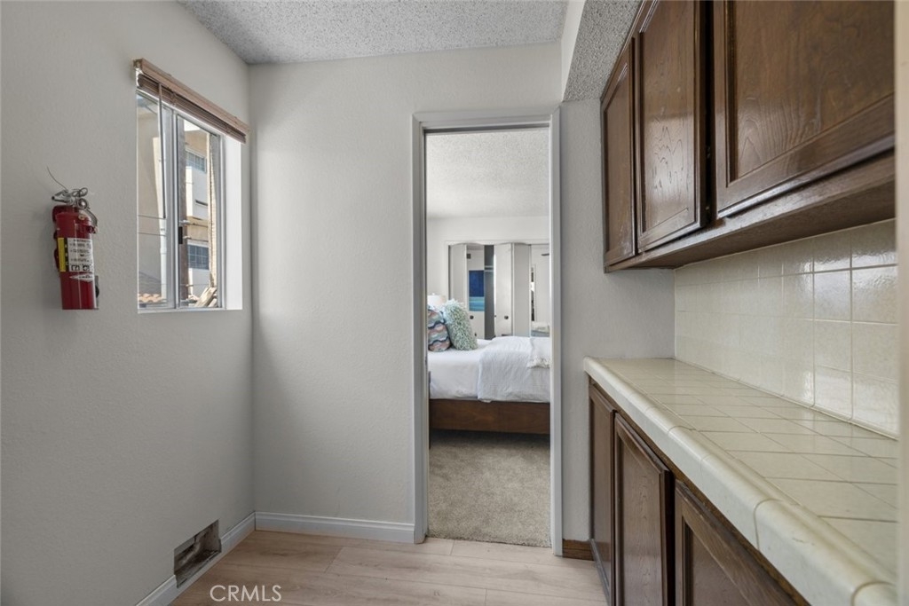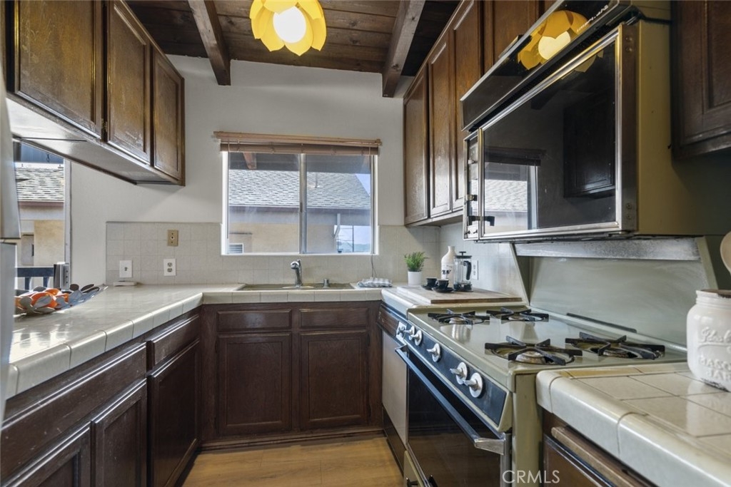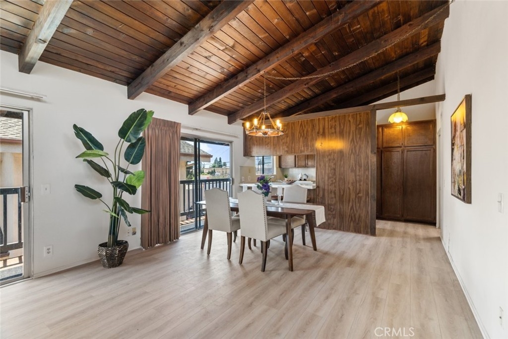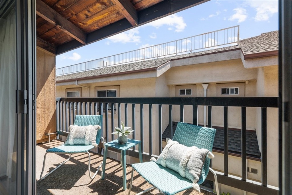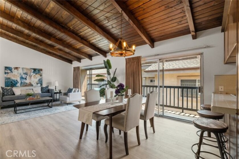 Marvelously spacious 1,126-sqft condo poised in the coveted city of Burbank! Enjoy this beautiful modern abode detailed with the freshly installed pale taupe laminate flooring, high sloped ceilings, and a well-sized balcony providing views of the surrounding neighborhood. The grandeur of the open living room and attached dining room are emphasized by the rustic flair of the wood-paneled, beamed ceiling highlighted by horizontal picture windows that effortlessly draw in natural sunlight. Vintage-style appliances paired with the rich mocha tone of the built-in cabinetry plus neat, tiled countertops provide this kitchen with everything need for delicious meals to be crafted and enjoyed. Down the hallway, both bedrooms include new plush carpet flooring and built-in closet space fitted with mirrored accordion doors. The lovely primary bedroom enjoys the exclusive benefit of an en-suite split bathroom complete with a vanity area. Unwind at the end of a long day from the private perch of the large balcony accessible from either set of sliding doors from the dining room or living room. 2 parking spaces (not tandem!) with 2 storage units. Nicely sized in-unit laundry room with shelves and cabinets. Only minutes away from the Burbank Town Center, major motion pictures studios, local markets, restaurants, shops, hiking trails, freeway access, and more! Discover prime Burbank!