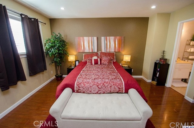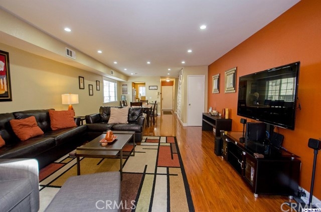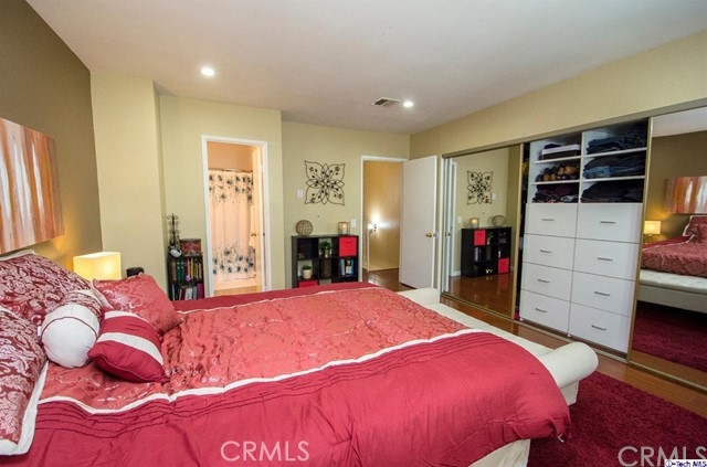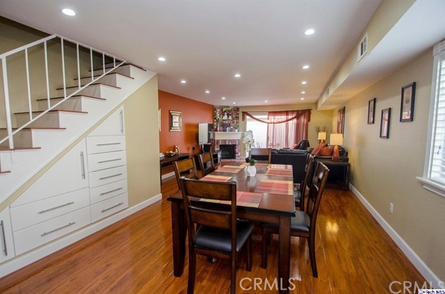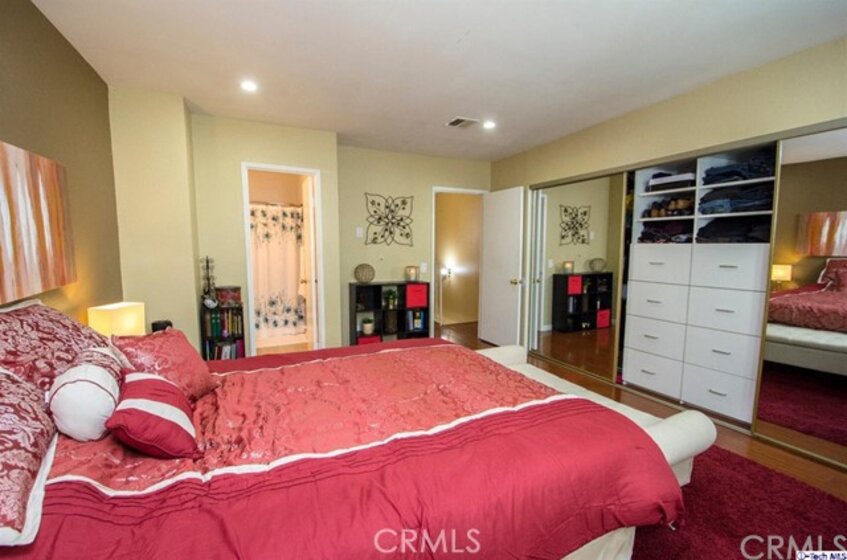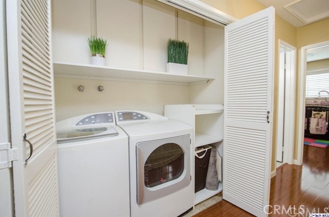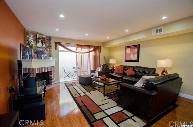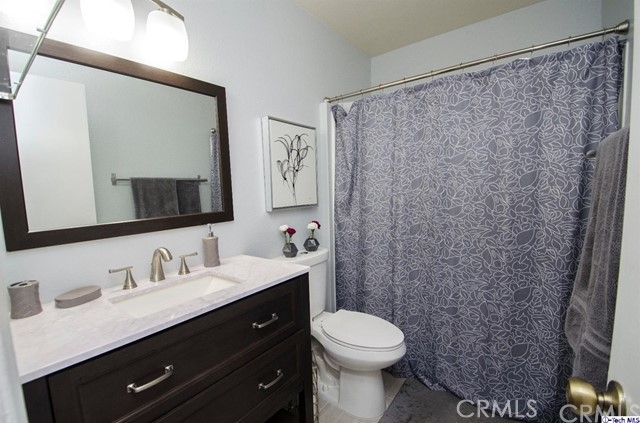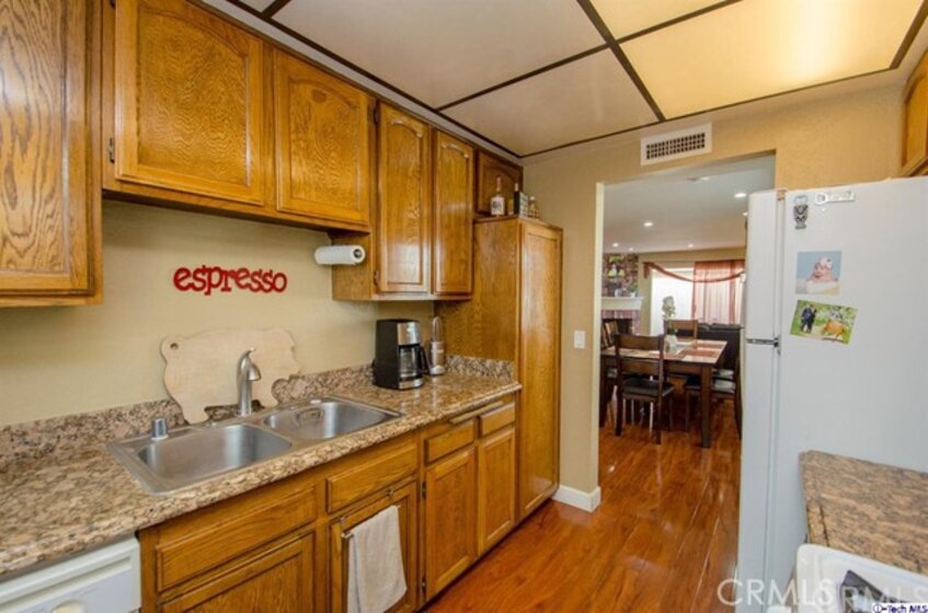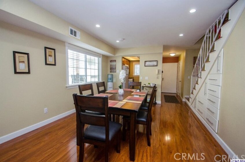 Stylish contemporary design in a private retreat. This airy and bright 2 bedroom 3 bath townhouse has been impeccably maintained! In this end unit, a modern open plan dining and living area lead to an enclosed patio for al fresco dining. Downstairs there are granite countertops in the classic galley kitchen and a remodeled powder room. Upstairs is the master bedroom with a full en-suite bathroom and large closet with custom shelving. The second bedroom also has custom closet shelving, and the laundry area is conveniently located upstairs. A recently remodeled guest bath has a modern vanity and elegant colors. Other features include a new energy efficient A/C system, canned lighting and unique architectural storage under the stairs. Located near the studios, Burbank Town Center, theaters, restaurants and hiking trails, this home is an absolute gem!