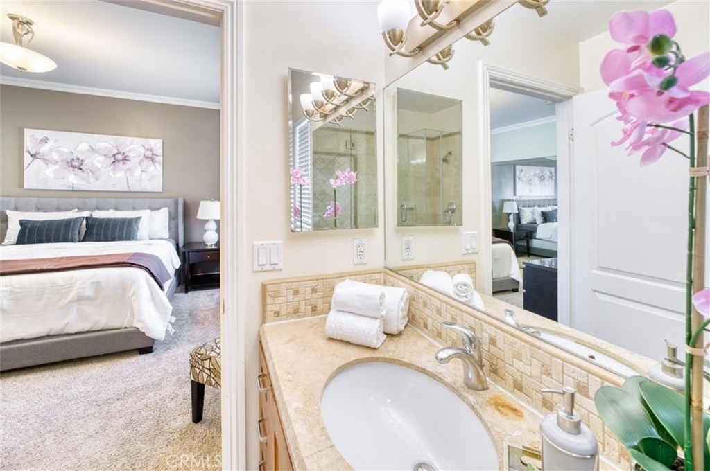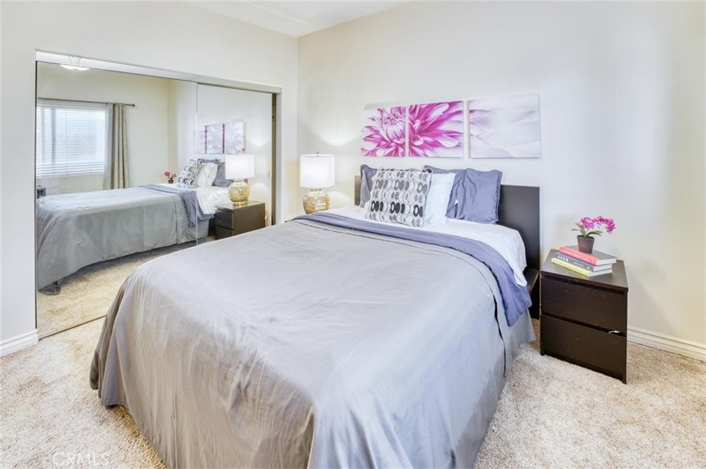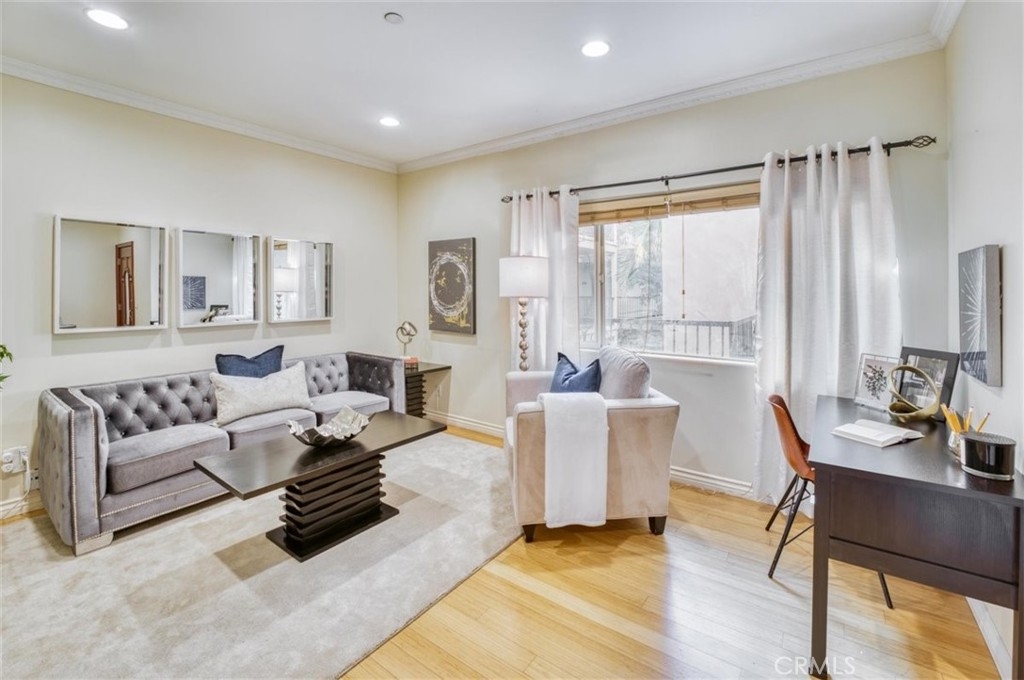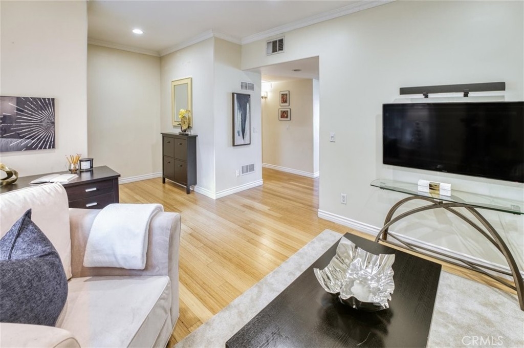 Executive condo in gated newer building with rooftop deck. This modern 2 bed 2 bath corner unit offers high ceilings and an open floor plan. The upgraded kitchen has refinished cabinets, granite counters, eat-in breakfast bar, stainless appliances, and recessed lighting. The kitchen is open to a flex room that can be used as a dining area, family room or office with access to a private balcony perfect for grilling or starting your day. There is a large primary suite with plenty of closet space and an upgraded primary bath with separate soaking tub and shower. There is an additional bedroom and upgraded guest bath, laundry closet inside the unit and the washer/dryer are included. Gated subterranean garage with 2 dedicated spaces and storage area plus guest parking. You can also enjoy a BBQ and mountain views from the community rooftop patio. Close to major studios, shopping, and restaurants.