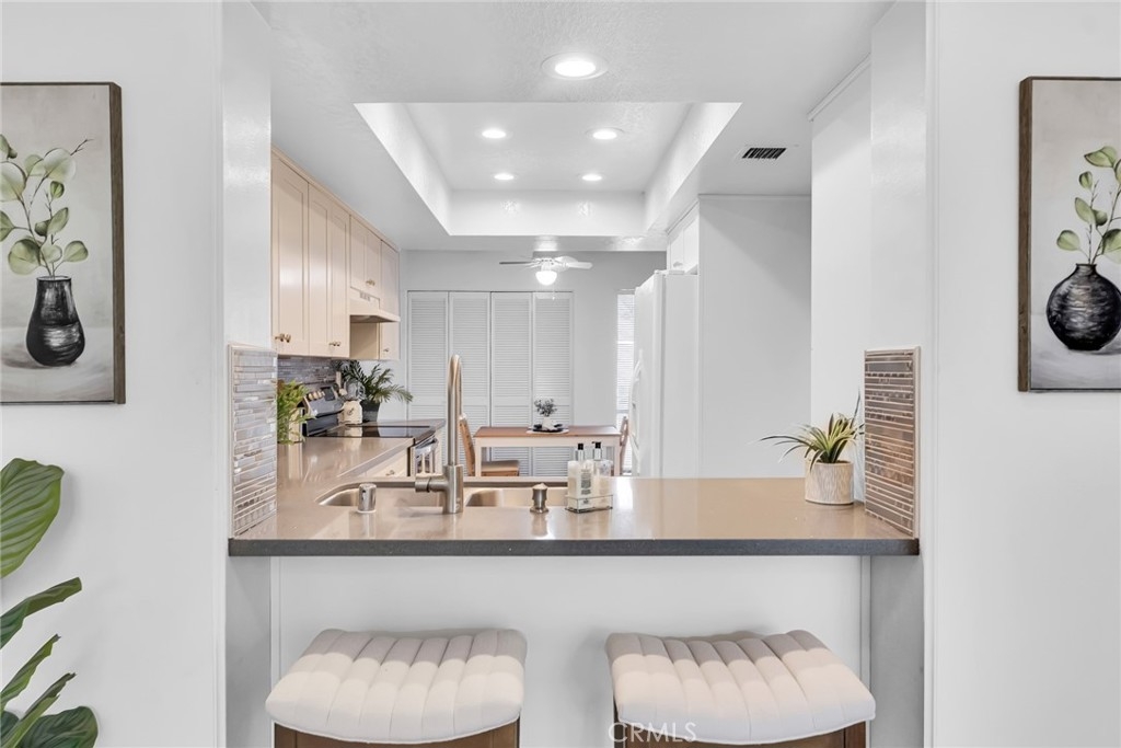 Rare top floor condo in Bethany Woods North, a highly desirable building with easy access to transit, shopping, and downtown Burbank's entertainment and social scene. This light filled unit with high ceilings has been beautifully remodeled and has gorgeous mountain views. The large living room and dining room area has access to a lovely balcony for enjoying your morning coffee. This kitchen was gorgeously remodeled with custom cabinets, tile backsplash, and quartz counters and stainless steel appliances, plus it has side by side laundry and a breakfast area. Two spacious bedrooms have ample closet space, and the primary suite has a gorgeous private bathroom. The complex has a spa and 2 subterranean parking spaces. This one is ready to move right in!
