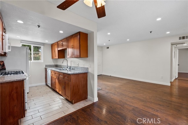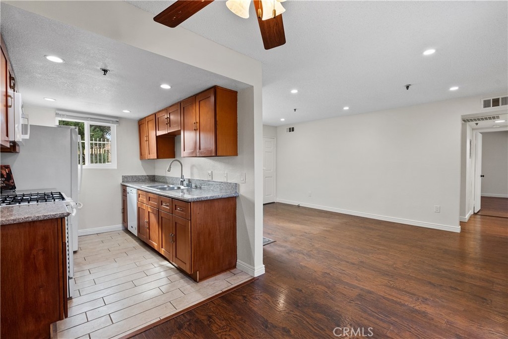 Welcome home to this lovely sought after single story condo! Quiet and serene. This gated and upgraded 2 bedroom and 2 bathroom condo in the City of Burbank offers brand new double pane windows and sliding glass door plus custom window coverings(2022), recessed lighting, all interior has been newly painted (2022) and more! Kitchen boasts newer cabinets and granite-like countertops (2016) and newer appliances (2019). Other improvements: beautiful wood-like flooring (2016), brand new ceiling fans 2022, mirrored closet doors, custom laundry closet to home the individual full size stackable washer and dryer (2019) plus more! Must see spacious main bedroom! Entertain your friends and family in the extra large, private back patio; the only unit offering direct access into the parking structure to avoid the rain. Complex only houses 13 units. Downtown Burbank, the Empire Shopping Center, many studios in Burbank are all nearby plus easy access to the freeway for commuters. Parking is assigned and offers two spaces (not tandem) in the secured gated garage. HOA includes: trash, water and the maintenance of the grounds PLUS Earthquake Insurance. Schools are part of the Burbank Unified School District and enjoy the extensive programming Burbank Parks and Rec has to offer.
