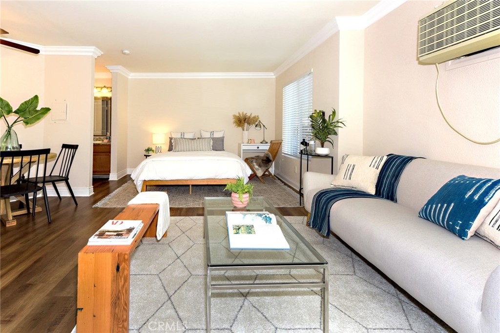 Privacy, Comfort and Serenity are highlighted in this immaculate first floor end unit condominium. Conveniently located in the Burbank Media District at the Entourage in a prime neighborhood next to Warner Brothers. Upon entering you will be greeted with natural light, crown molding and custom, wide plank flooring. The granite countertops, stained wood cabinetry, and the stainless-steel appliances including gas stove and range compliment this exceptional kitchen. Throughout you will embrace the soft tones and the days light. The walk-in closet, custom shower upgrade & the lovely living, dining and bedside workspace are ideal for this beautiful studio. The double pane windows and blinds allow for privacy and provide energy efficiency. Amenities to this great complex include gated parking featuring your own assigned parking spot, secured access entries, laundry facility, fitness center, Jacuzzi, lounge seating and a BBQ grill area. Suitable walking distance to shops, grocery, Starbucks, dining, and entertainment as well as easy freeway access and just minutes from the Burbank Airport. This exquisite condo has all the grace, comforts and conveniences to call HOME!!!