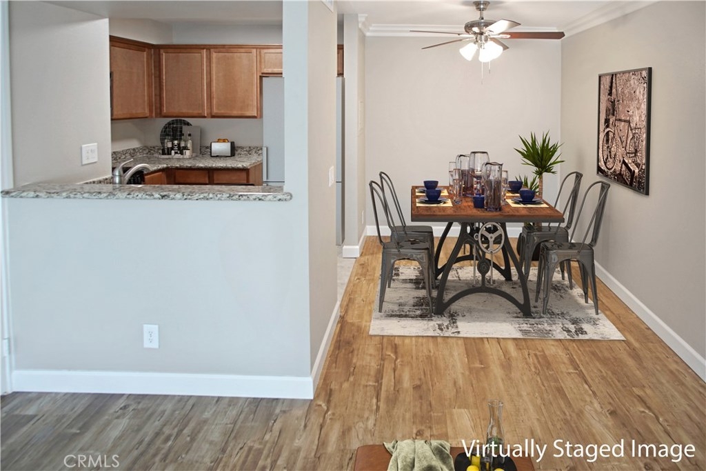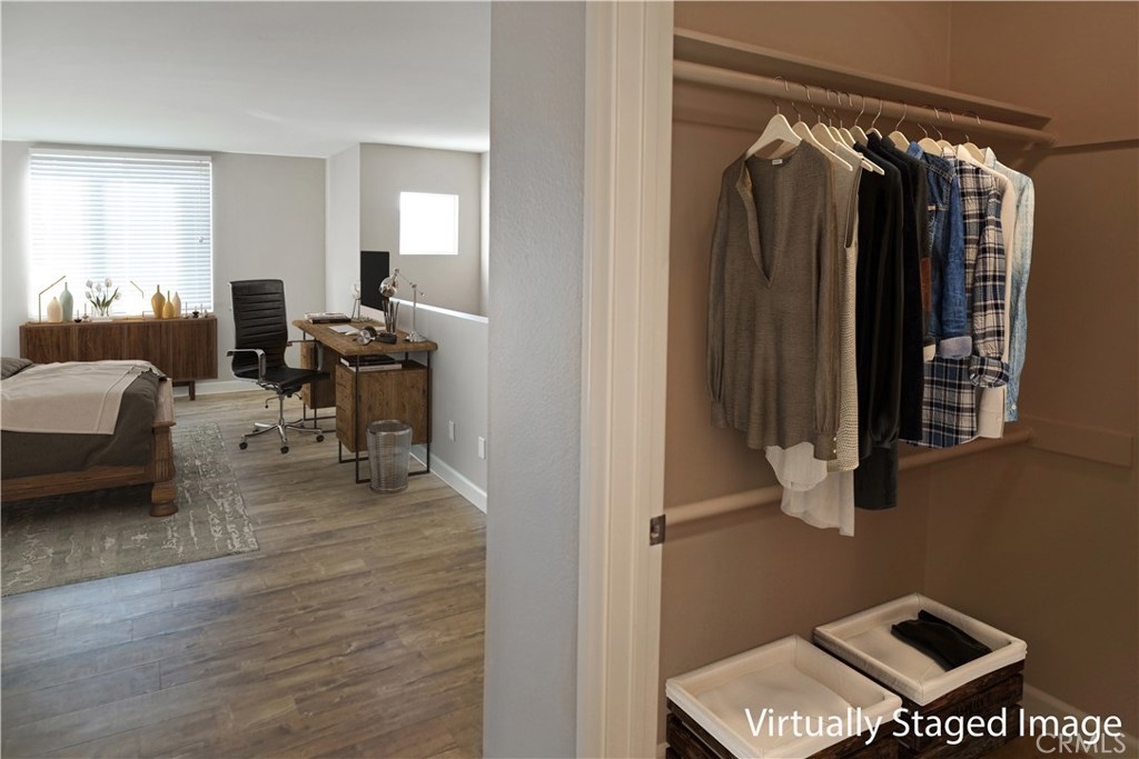 Possibly the most desirable townhouse in The Entourage! Townhouse style condo (no one above!) with loft bedroom. Southern exposure provides all-day light with a balcony that overlooks the main courtyard and the community gym is just steps away. From the balcony a sliding glass door passes light through to the brand new vinyl wood plank flooring. Perfectly appointed kitchen with granite countertops, breakfast bar, and combo washer/dryer. Charming first floor powder room with brand new tile flooring. The new vinyl wood plank flooring continues up the open stairway to the loft style bedroom which has plenty of room for a work from home space. The bedroom suite is finished off with a walk-in closet and full bathroom with a brand new vanity. Central air and heat, energy efficient windows and the always coveted 2nd parking space are icing on the cake. Modern, freshly painted, and move-in ready. The Entourage is highly sought after for its location and amenities. Tucked away in Burbank’s Studio District with a great walking score… walk to shopping centers, Starbucks, Whole Foods and to Riverside Drive. Complex amenities include gym, spa, barbecues, multiple outdoor seating areas, laundry facility, garage storage and designated parking; all with a low HOA fee of $264. Private and secure… You’re going to love living here! Listing contains 'Virtually Staged Images" with the original images included for reference.