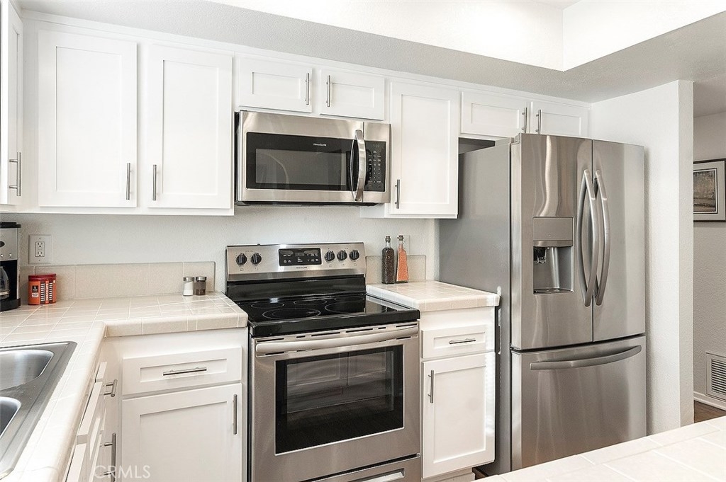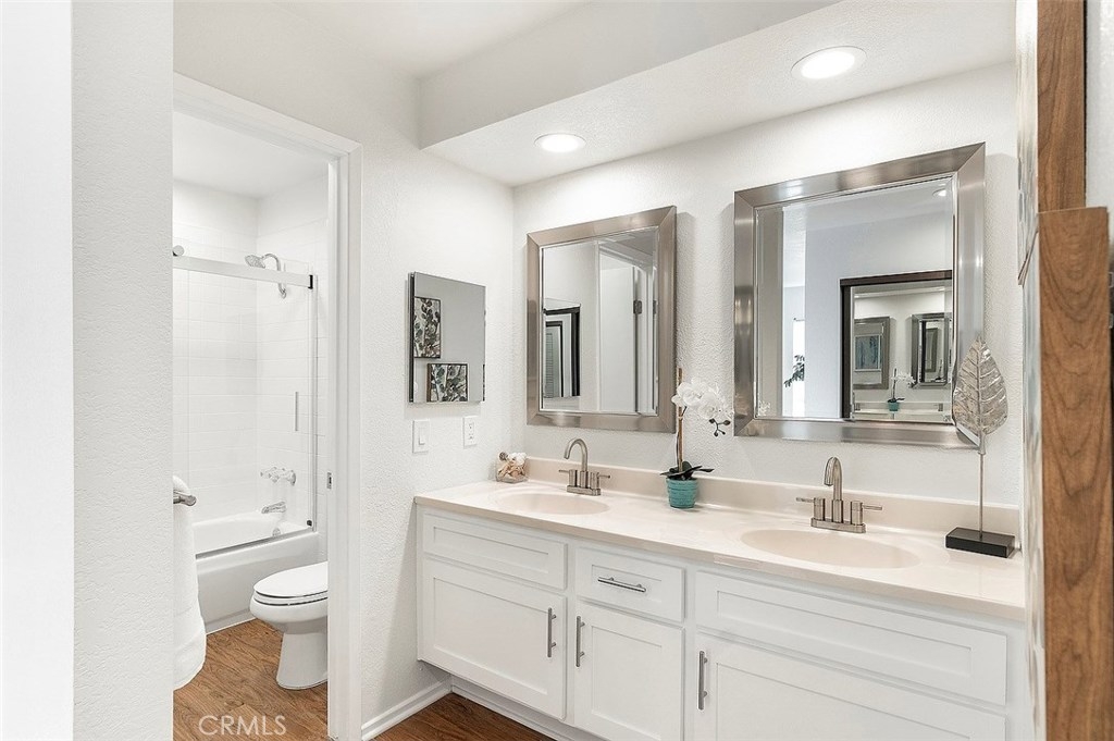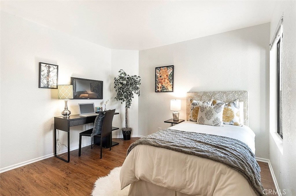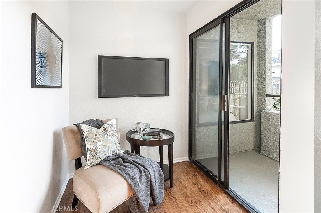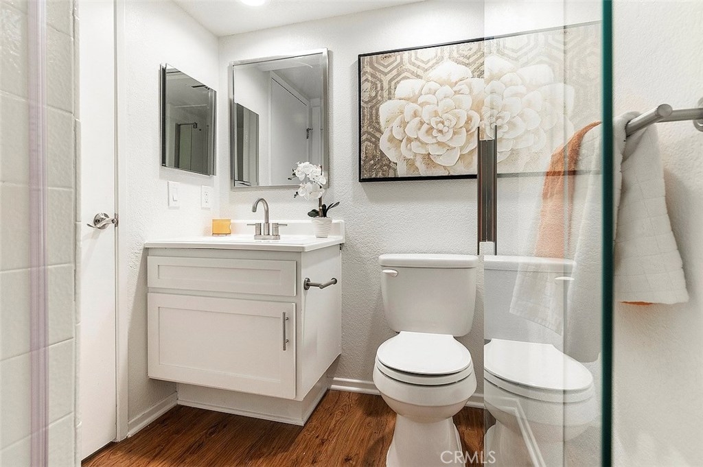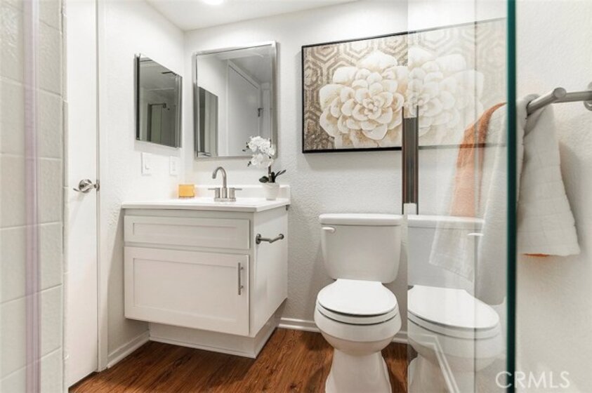 This beautifully renovated 2-bedroom, 2-bathroom condo, located at the back of the complex for the ultimate privacy is a must see! Walk into the cozy family room that aluminates with bright and natural light through the sliding glass doors that lead to the patio. The patio is perfect for enjoying a morning cup of coffee or relaxing in the evening with a good book. The dry bar in the dining room is perfect for enjoying a quick breakfast or entertaining. The kitchen has brand-new stainless-steel appliances and generous counter space. The master bedroom is complimented with dual sinks, newly installed seamless glass shower doors and two oversized closets. Enjoy a quiet moment while you sit on the patio that leads out from the master bedroom. With a freshly painted interior, updated hardwood flooring and recessed lighting this home has it all.