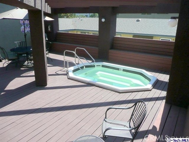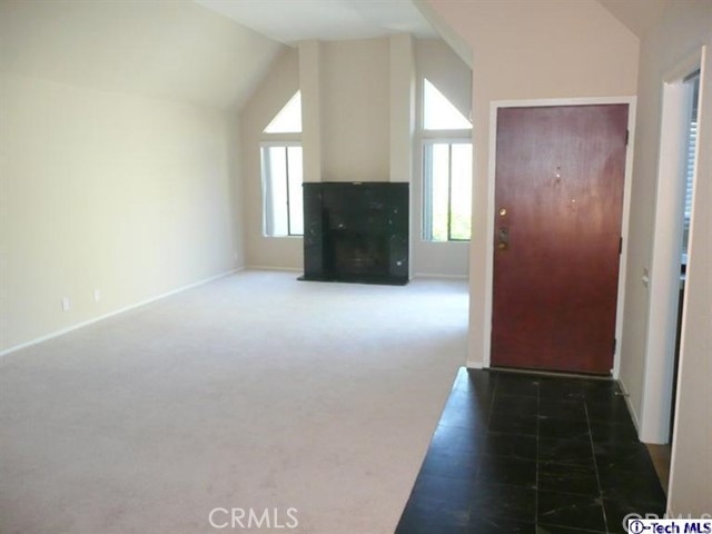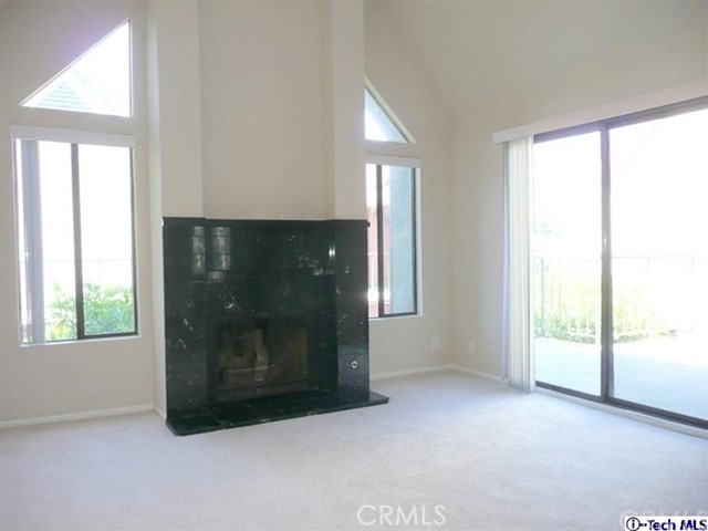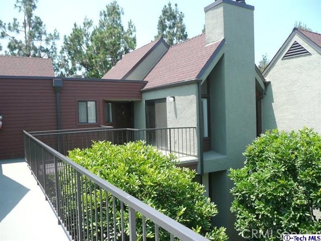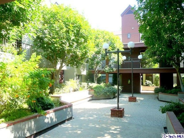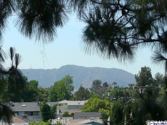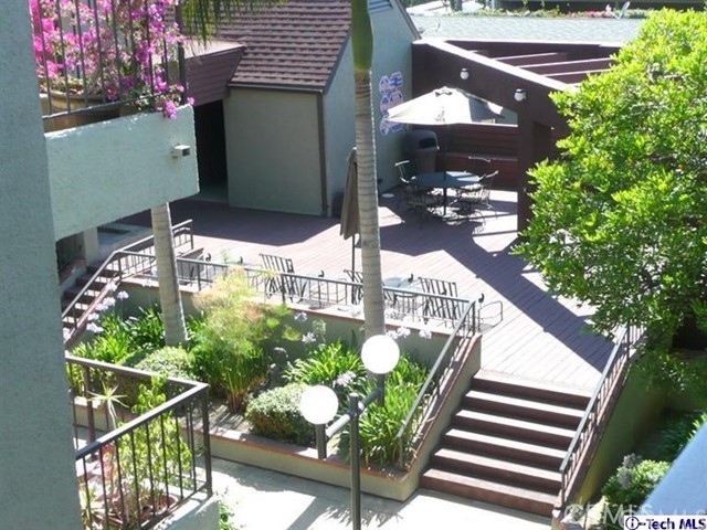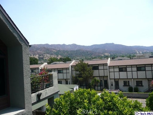Top floor, single level townhome. Beautiful, architecturally innovative complex creates sense of privacy for each unit. Well-designed lush landscaping throughout complex. Light & bright unit has long black marble entry that borders offset living rm w/high vaulted ceiling. Black marble fireplace anchors end of living room & dramatically flanked by floor to ceiling windows. Unit has view of Verdugo Mts on one side & Mts of Griffith Park on the other. New paint and carpeting throughout. Cent air & heat. In-unit laundry. Mstr suite has high vaulted ceiling, large walk-in closet, full bath w/dual sinks. A 2nd private balcony between bedrooms. Elevator access to subterranean parking. 2 parking spaces located across from elevator. Common area has large deck area w/spa & shower & new patio furniture. Exterior of bldg. recently painted & new roof installed several yrs ago. HOA fee includes Earthquake Ins which many complexes do not. Assoc has good financial reserves. STANDARD SALE