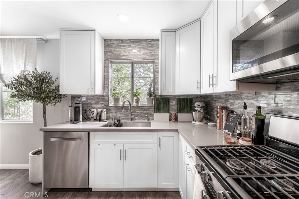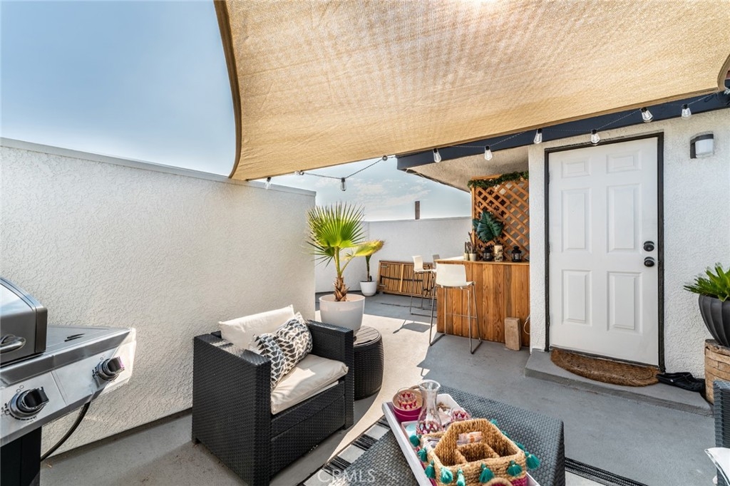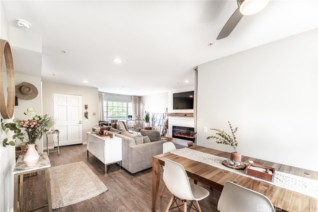 Enter this wonderful three-story unit with a beautiful and comforting open floor plan. Main floor features the spacious living room with a custom decorative fireplace with wooden mantel. Continue to the dining area and enter the remodeled open kitchen with white craftsman cabinets, quartz countertops, and glass tile backsplash. The main floor also includes a half bath with stone countertops and a private balcony off the living room perfect for morning coffee. Upstairs features two spacious bedrooms with recessed lights, a large remodeled full bathroom complete with a tile shower tub, and a large vanity with lots of counter space. Most unique thing about this unit is the third-floor private rooftop deck perfect for a entertaining. Enjoy the beautiful mountain views and the fireworks. Gated parking is at the ground floor and the unit has two tandem parking spaces. Laundry is in common area but each unit has its own washer/dryer. Large storage closet by the parking. Conveniently located near walking trails, Mc Cambridge Park, Burbank Tennis Center, Costco, and shopping and dining at the Empire Center.