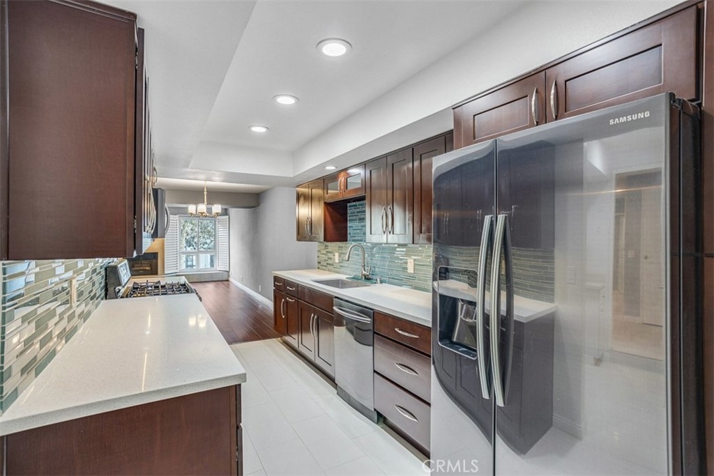 This beautifully updated 2-bedroom, 2-bathroom, 1,375 sq. ft. condo is situated in one of the most desirable locations within a highly sought-after building in Burbank proper and the heart of Toluca Lake, and is the largest floor plan in the building. The main living area features warm wood floors and an open-concept floor plan that seamlessly connects the living and dining spaces. A spacious private balcony and a bonus living area with a fireplace enhance the charm of this home. The fully remodeled chef’s kitchen is a standout, boasting elegant cabinetry, expansive modern countertops, a stylish glass tile backsplash, and a suite of stainless-steel appliances. The primary suite offers an oversized walk-in closet, private balcony access, and a luxurious en suite bathroom complete with a dual-sink vanity, a soaking tub, and a walk-in shower adorned with contemporary fixtures and stunning tile work. The second bedroom is generously sized and is served by a full guest bathroom featuring chic chevron tile, a glass enclosure, and a modern vanity. Additional upgrades include a new HVAC system (2019), dual pane windows and sliding doors (2023) and recessed lighting throughout. The condo comes with two side-by-side parking spaces equipped with an EV charger, an additional storage cabinet, and in-unit washer and dryer hookups. Building amenities include a pool, spa, community room, bike storage, secure controlled access and app controlled video monitoring and access for each resident. Conveniently located within walking distance of Toluca Lake’s shops and restaurants, this home also benefits from access to Burbank’s exceptional schools, police, and fire dept. Welcome home!