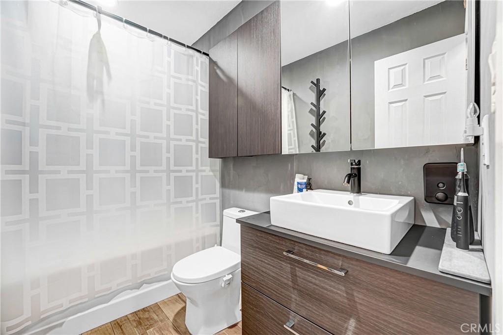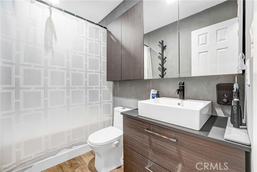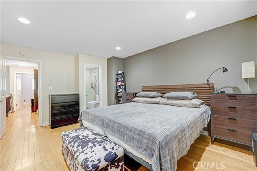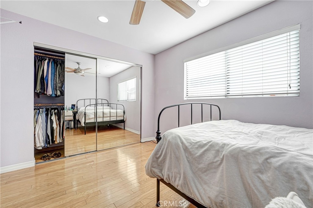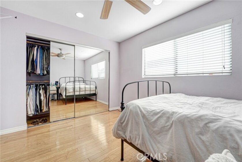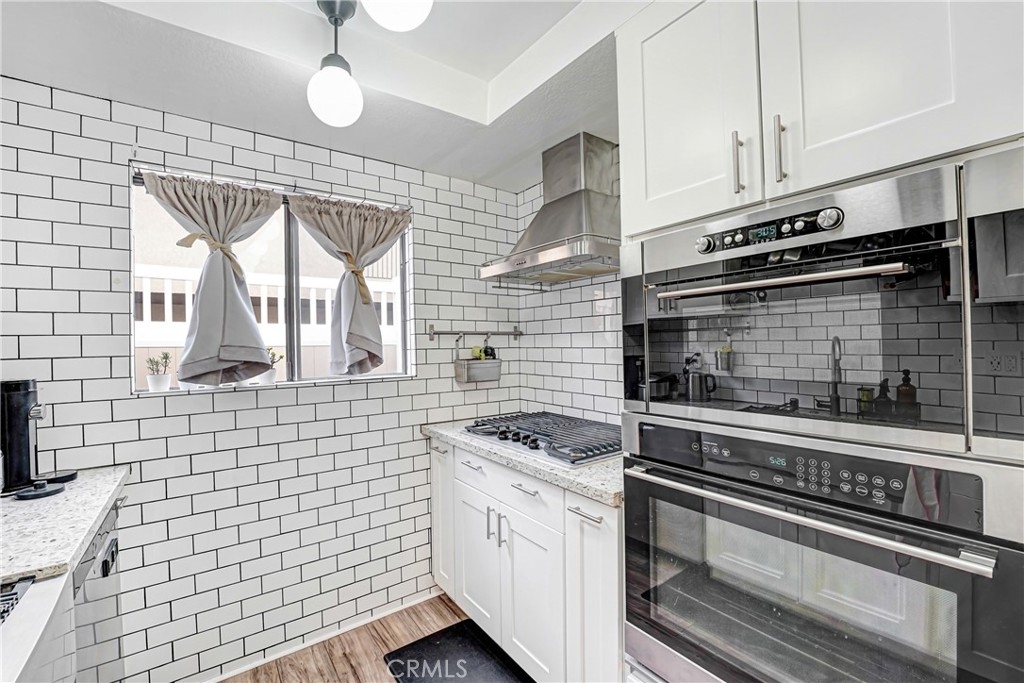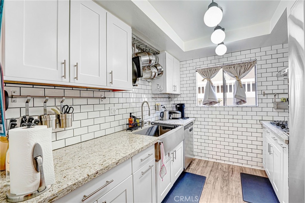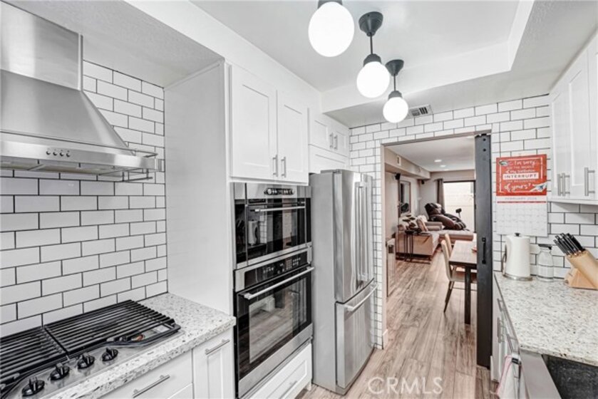 Welcome home to this perfectly located, two-story renovated condo in the heart of Burbank—just steps from everything you love. Upon entry, you’re greeted by a spacious open-concept living and dining area featuring a cozy brick fireplace, updated luxury vinyl plank flooring, and modern lighting throughout. The generously sized dining space flows seamlessly into a beautifully appointed custom kitchen, complete with subway tile backsplash, shaker cabinetry, stainless steel appliances, a double oven, gas range with hood, and dishwasher. Step outside to your private walk-out patio—an ideal spot to enjoy morning coffee, entertain guests, or soak up the California sunshine. A convenient downstairs half bath makes the main level perfectly suited for entertaining. Upstairs, a central landing offers abundant storage with custom closets and an in-unit stackable washer and dryer. The spacious primary suite easily accommodates a king-size bed and full bedroom furniture, and features wall-to-wall closet space. The attached, fully renovated bathroom includes a sleek glass-enclosed shower with a rain showerhead. The second bedroom is equally impressive, with easy access to another updated full bathroom—perfect for guests, family, or a home office. Completing the home are two gated garage parking spaces, making commuting effortless—though you may rarely need your car. This condo is just a short walk to Burbank Town Center, along with an abundance of shopping, dining, and nearby Griffith Park.