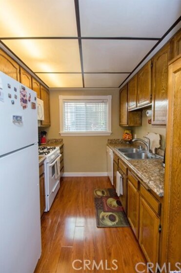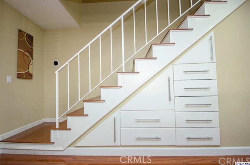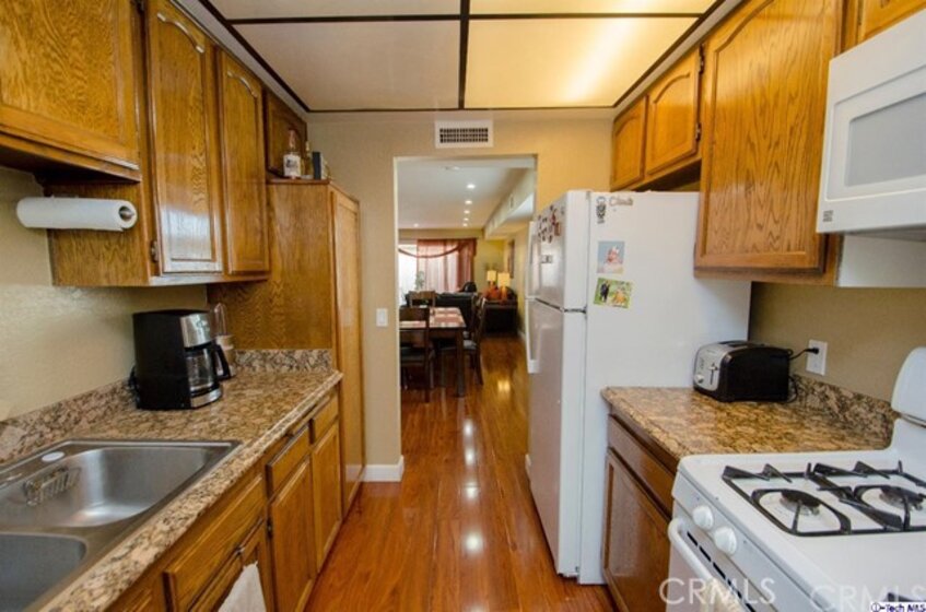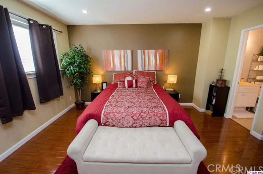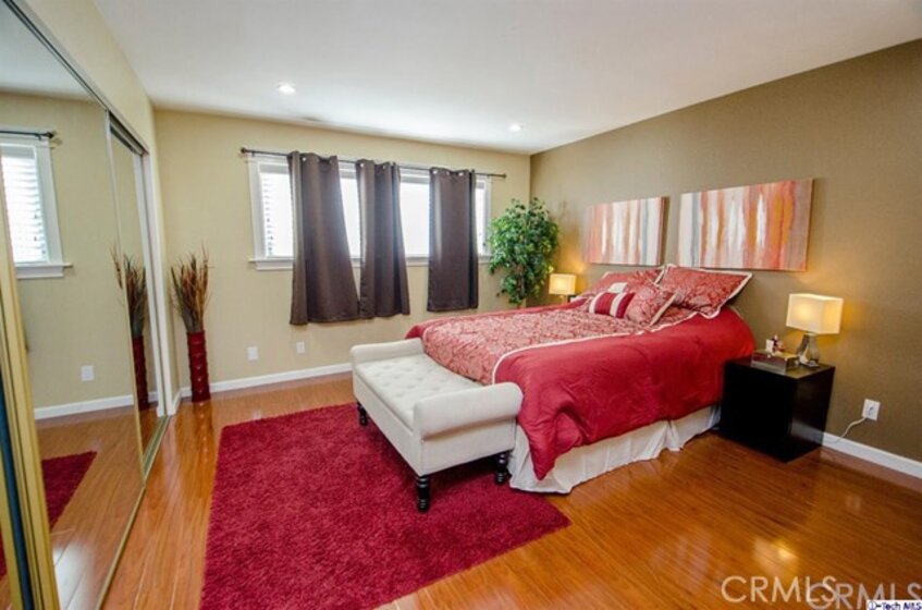 Stylish contemporary design in a private retreat. This airy and bright 2 bedroom 3 bath townhouse has been impeccably maintained! In this end unit, a modern open plan dining and living area lead to an enclosed patio for al fresco dining. Downstairs there are granite countertops in the classic galley kitchen and a remodeled powder room. Upstairs is the master bedroom with a full en-suite bathroom and large closet with custom shelving. The second bedroom also has custom closet shelving, and the laundry area is conveniently located upstairs. A recently remodeled guest bath has a modern vanity and elegant colors. Other features include a new energy efficient A/C system, canned lighting and unique architectural storage under the stairs. Located near the studios, Burbank Town Center, theaters, restaurants and hiking trails, this home is an absolute gem!