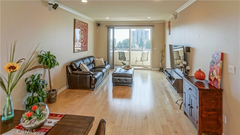 Top floor Luxury 2 bedroom, 2 bath Condo with 1,230 Sq. Ft. includes sweeping views of the mountains and the city just steps to downtown Burbank with shopping, dining and entertainment! An elevator takes you to a bamboo lined walkway to your front door. Upon entrance you will be greeted with natural light from east to west, wood floors, dual pane sliding glass doors, open floor plan, and balconies’ off the spacious dining room and family room. From the dining room you will enter the upgraded kitchen with high end appliances, reverse osmosis system and granite counter tops. As you head towards the bedrooms there is a remodeled bathroom along with private high end washer and dryer. As you enter the master bedroom you are greeted with sweeping views of the mountains off your 3rd private balcony with an additional storage closet. Also large dual closets and a large master bathroom with dual sinks complete the master suite area. The community offers a private elevator at street level for easy Handicap access, a private parking garage with 2 parking spaces, and a private phone intercom system for when guests come to visit. Also included is the Frig, Washer and Dryer. Come and see this amazing Condo that you will call home!!