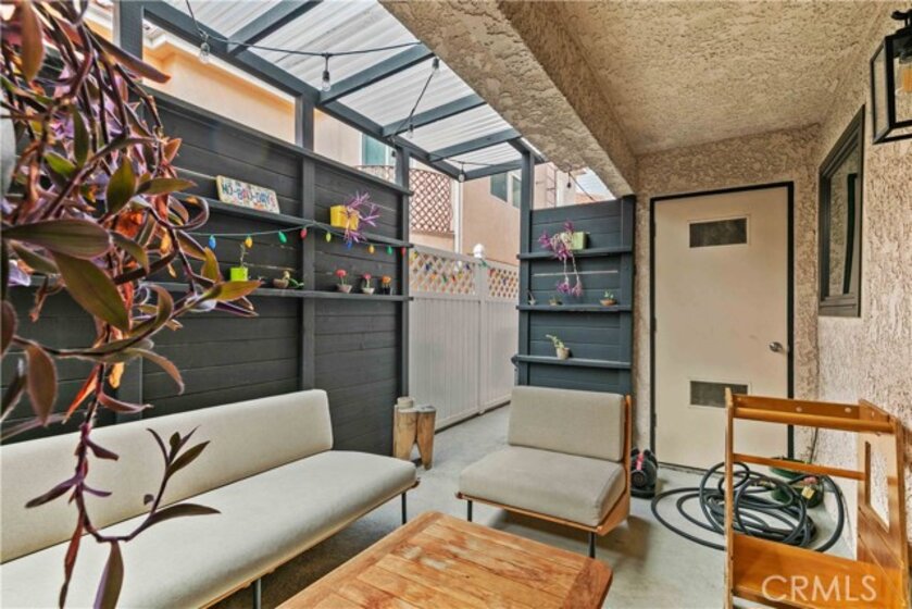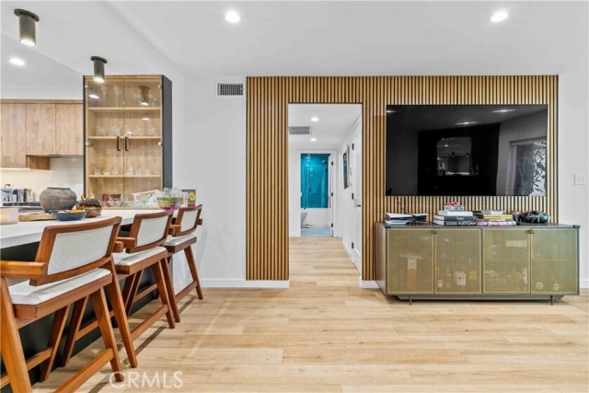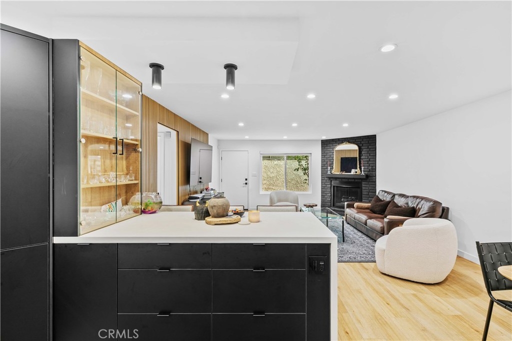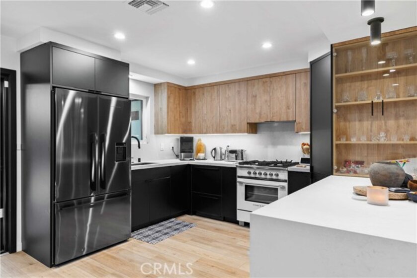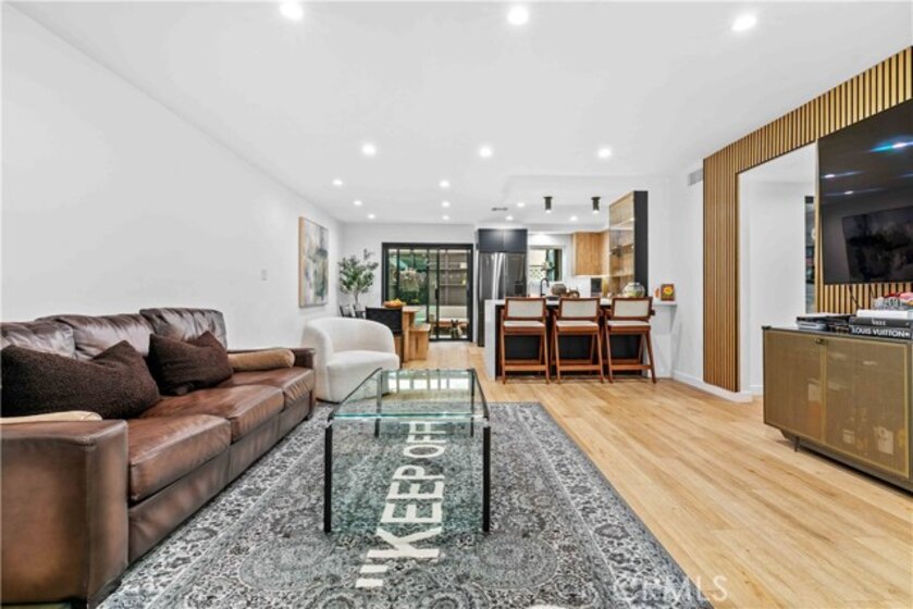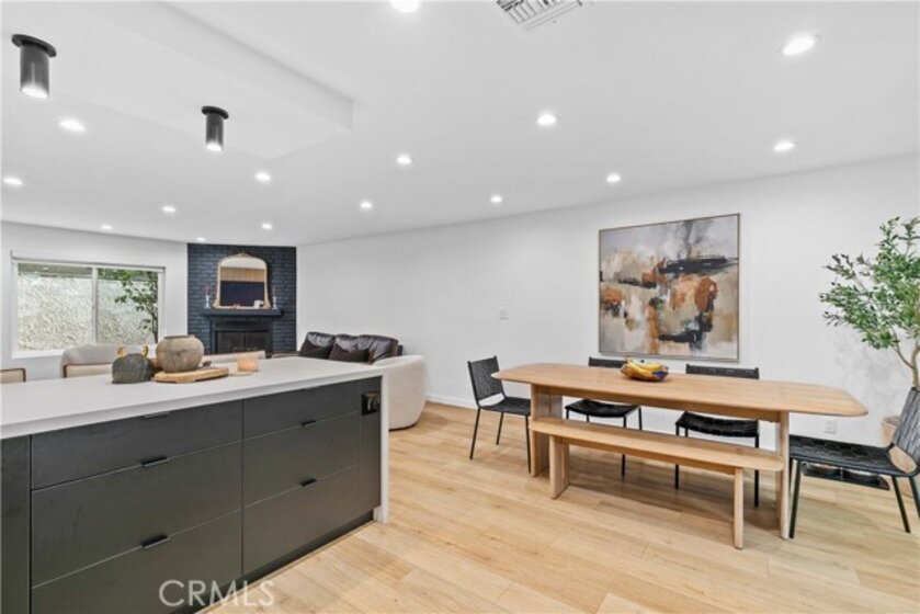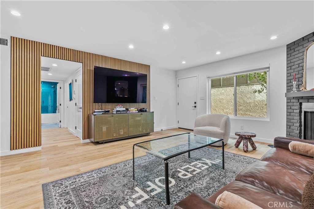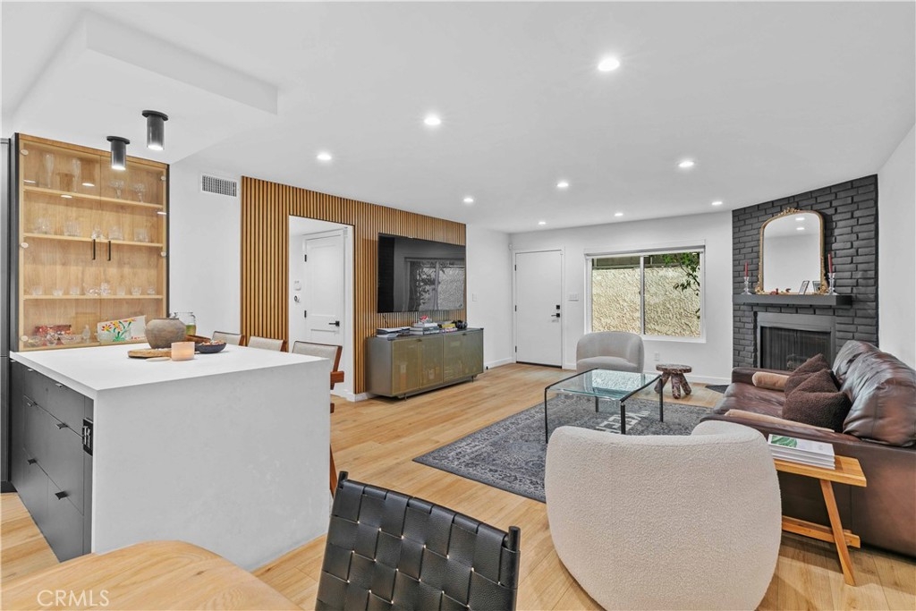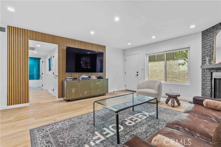 Discover elevated Burbank living in this fully remodeled, single-level condo offering 1,231 sq ft of curated design and effortless comfort. Every detail has been thoughtfully reimagined with premium finishes and a clean, modern aesthetic. An open floor plan anchors the home, highlighted by smooth-coat walls + ceilings, updated windows, wide-plank flooring, and recessed lighting. The living room centers around a striking black brick fireplace and custom wood-slat media wall (TVs included). Large sliding doors blur the line between indoors and out, opening to an oversized covered patio—your new lounge, dining deck, and year-round hangout. The patio/side yard adds extra space for grilling, dinning and storage. The grilling station and dedicated lighting will be included. The kitchen delivers style and function with a full Fisher & Paykel appliance suite (gas range/oven, French-door refrigerator, dishwasher), matte black cabinetry, warm wood uppers, quartz surfaces, under-cabinet lighting, a glass-front display cabinet, and peninsula seating. Both bedrooms feel calm and intentional, offering generous closets, custom shelving, and a built-in vanity desk. One bathroom features a Restoration Hardware sink, while both are finished with designer tile, Brizo fixtures, and modern detailing. The dedicated laundry room adds convenience with built-ins and a glass-door entry. Smart upgrades include an alarm system, central HVAC, and secured garage parking with two assigned spaces + dedicated Tesla/EV charging. Private storage cabinets are located above the parking. Situated in a convenient Burbank location near shops, dining, studios, and local amenities, this turnkey residence pairs sharp design with everyday ease. A rare blend of function, style, and comfort.