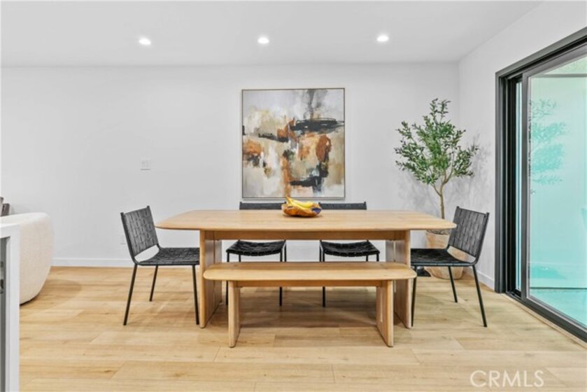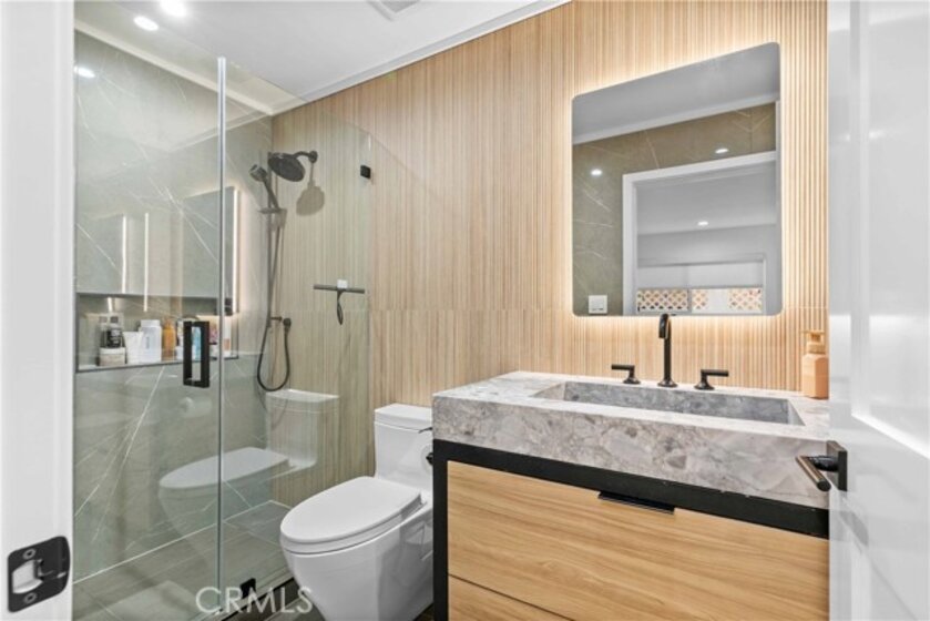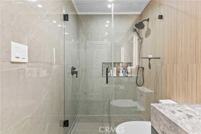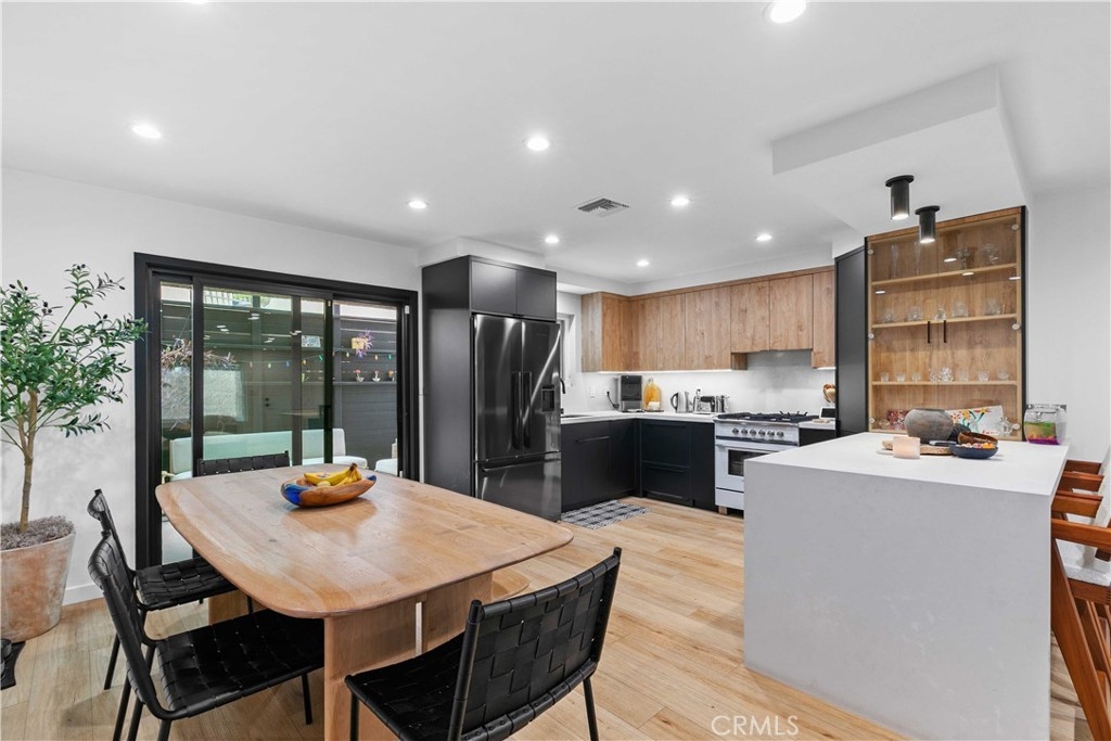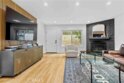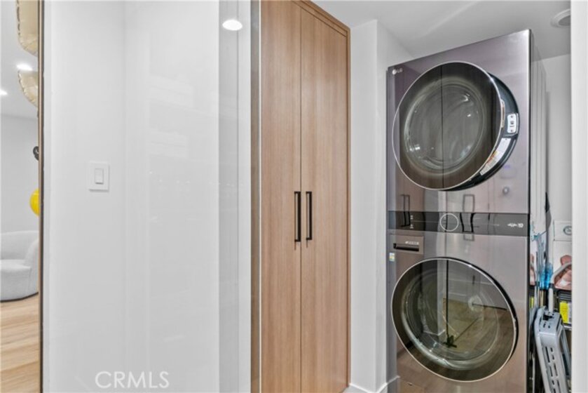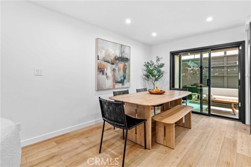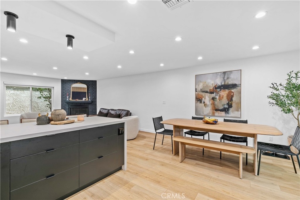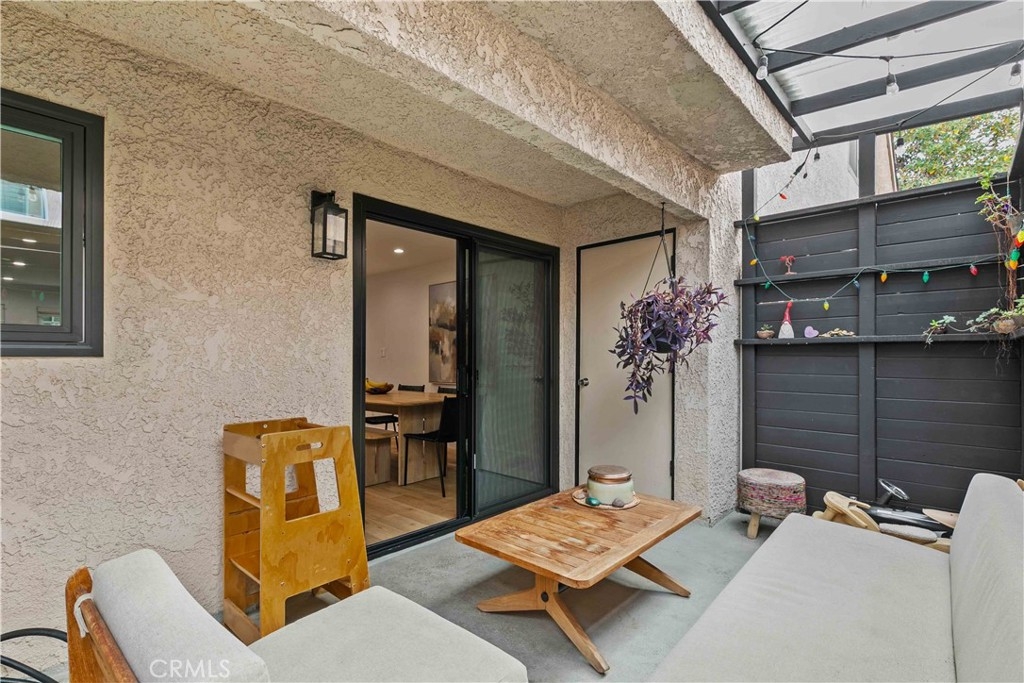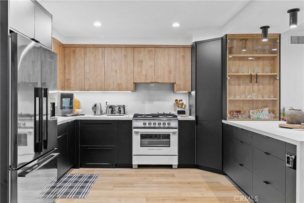 Discover elevated Burbank living in this fully remodeled, single-level condo offering 1,231 sq ft of curated design and effortless comfort. Every detail has been thoughtfully reimagined with premium finishes and a clean, modern aesthetic. An open floor plan anchors the home, highlighted by smooth-coat walls + ceilings, updated windows, wide-plank flooring, and recessed lighting. The living room centers around a striking black brick fireplace and custom wood-slat media wall (TVs included). Large sliding doors blur the line between indoors and out, opening to an oversized covered patio—your new lounge, dining deck, and year-round hangout. The patio/side yard adds extra space for grilling, dinning and storage. The grilling station and dedicated lighting will be included. The kitchen delivers style and function with a full Fisher & Paykel appliance suite (gas range/oven, French-door refrigerator, dishwasher), matte black cabinetry, warm wood uppers, quartz surfaces, under-cabinet lighting, a glass-front display cabinet, and peninsula seating. Both bedrooms feel calm and intentional, offering generous closets, custom shelving, and a built-in vanity desk. One bathroom features a Restoration Hardware sink, while both are finished with designer tile, Brizo fixtures, and modern detailing. The dedicated laundry room adds convenience with built-ins and a glass-door entry. Smart upgrades include an alarm system, central HVAC, and secured garage parking with two assigned spaces + dedicated Tesla/EV charging. Private storage cabinets are located above the parking. Situated in a convenient Burbank location near shops, dining, studios, and local amenities, this turnkey residence pairs sharp design with everyday ease. A rare blend of function, style, and comfort.