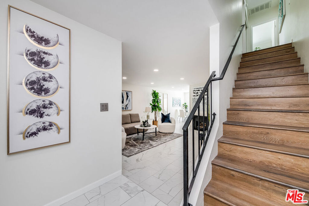 Welcome to this exceptional 2-bedroom, 2.5-bath townhome in the highly sought-after Cabrini Villas, perched in one of the community's most desirable top locations with greenbelt, canyon, and mountain views. Nestled in the scenic Burbank Hills above Glenoaks Blvd, this residence offers the perfect blend of tranquility, convenience, and opportunity priced to provide compelling value in one of Burbank's most established communities.Spanning approximately 1,244 square feet, this light-filled home features an open and airy floor plan enhanced by high ceilings, recessed lighting, engineered hardwood flooring, and a cozy fireplace that anchors the inviting living room. Sliding doors create a seamless indoor-outdoor flow, opening to a private patio ideal for morning coffee, entertaining guests, or simply enjoying the peaceful natural surroundings. The dining area connects effortlessly to a stylish remodeled kitchen complete with stainless steel appliances, abundant cabinetry, generous countertop space, and a functional layout. A chic powder room completes the main level.Upstairs, two spacious bedrooms provide comfort and privacy. The primary suite is a true retreat, offering a walk-in closet with built-ins, an en-suite bath and access to a private balcony with serene hillside views. The secondary bedroom is generously sized with ample closet space and its own en-suite bath, making it perfect for guests, family, or a home office.The lower level adds versatility with a bonus area ideal for a gym, workspace, or additional storage, along with a dedicated laundry area and direct access to a private two-car attached garage.Residents of Cabrini Villas enjoy resort-style amenities including 7 pools and spas, tennis courts, pickleball courts, basketball and volleyball courts, a clubhouse, playground, and 24/7 security. The HOA also covers water, trash, cable, sewer, high-speed internet with streaming services and cable, and earthquake insurance, enhancing both value and convenience. Ideally located near Downtown Burbank, Magnolia Park, major studios, shopping, dining, hiking trails, and with easy access to the I-5 freeway, this home offers a rare opportunity to enjoy elevated community living while creating a space that truly reflects your personal style. Come experience this beautifully positioned, move-in-ready townhome and make it yours today.